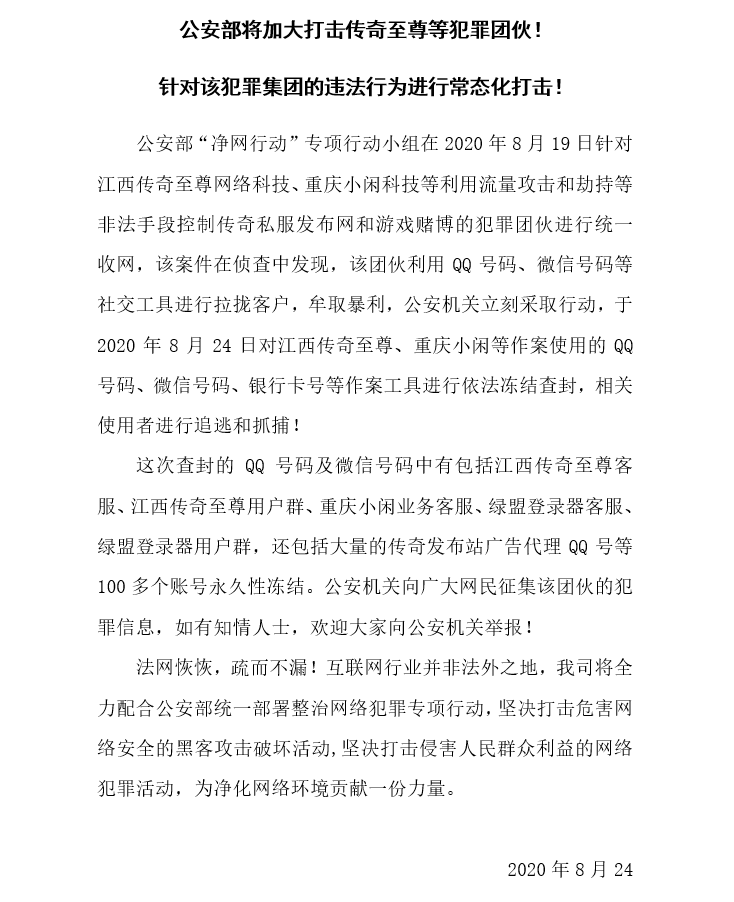 公安部“净网行动”专项行动小组在2020年8月19日针对江西传奇至尊网络科技、重庆小闲科技等利用流量攻击和劫持等非法手段控制传奇私服发布网和游戏赌博的犯罪团伙进行统一收网,该案件在侦查中发现,该团伙利用QQ号码、微信号码等社交工具进行拉拢客户,牟取暴利,公安机关立刻采取行动,于2020年8月24日对江西传奇至尊、重庆小闲等作案使用的QQ号码、微信号码、银行卡号等作案工具进行依法冻结查封,相关使用者进行追逃和抓捕!